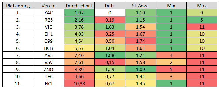 Die Tabelle gibt den durchschnittlichen Wert pro Verein an, die Differenz des jeweiligen Durchschnitt zur nächstgelegenen Platzierung, die Standarabweichung sowie höchste und niedrigste abgegebene Platzierung.
